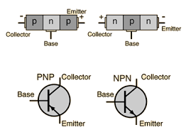 El transistor bipolar es el más común de los transistores, y como los diodos, puede ser de germanio o silicio. Existen dos tipos transistores: el NPN y el PNP, y la dirección del flujo de la corriente en cada caso, lo indica la flecha que se ve en el grafico de cada tipo de transistor